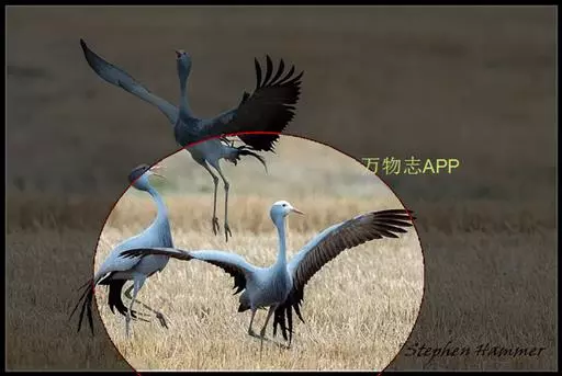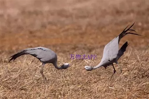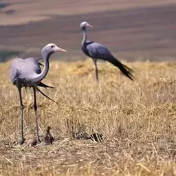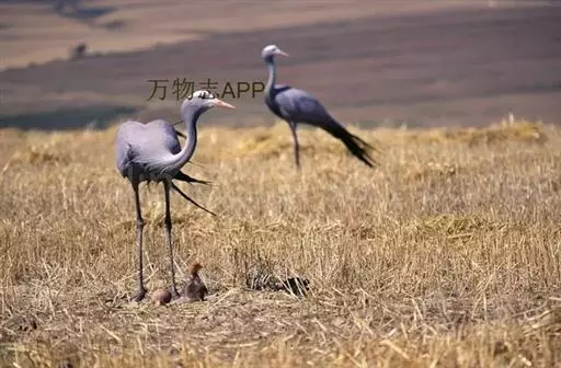 蓝鹤一般在春天筑巢孵蛋,通常一窝蛋只有两枚。有时这两枚蛋就直接产在光秃秃的地面上。但如果仔细观察,你会在蛋的底部发现一层不很明显的、薄薄的垫子。它是由干草、动物排泄物,甚至小石头等物构成的。在我观察过的一个鹤巢里,就发现有几百件这样的小东西。蓝鹤应该属于在繁殖期会变得特别醒目而漂亮的鸟类之一。而且看来在选址筑巢方面,它们显然十分粗心,过于草率。因为它们用于孵蛋的鸟巢总是筑在毫无遮掩的平地上。此外,它们全身的羽毛也毫无伪装。在这方面它们跟其他一些同样喜欢在平地上筑巢孵蛋的大型鸟类相比,如斯坦利的地鵏(Stanley’s Bustard),就大不一样。通常,人们在大约一公里之外就可以发现正在孵蛋的蓝鹤。