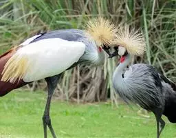 蓝鹤是南非的国鸟。然而最近,在为南非军队制服的盾形纹章选择新标志时,它败给了具有战士雄风的“秘书鸟”(鹭鹰)。蓝鹤同时也是先前的“南非鸟类学会”的会标。不过最近新成立的“南非鸟生活”组织,则以国际通用的燕鸥标志作为其会标。其实用蓝鹤作为象征南非的国鸟是再合适不过了。它个头够大,体形独特优美,外表安详而自信。尤其是当它偶尔像芭蕾舞者那样旋转着翩翩起舞时,或是快乐地“高歌”时,就更能充分地展示它超凡脱俗的特色。最重要的还是它所独具的土生土长的“地方性”。蓝鹤原本只分布在南非,唯独有一个小分支,远离它们南方的“表亲”,北上栖息在纳米比亚的埃托沙盐沼地(Etosha Pan)。蓝鹤也会季节性地跨越国界,飞到邻近的莱索托、斯威士兰、博茨瓦纳,甚至津巴布韦等国家,偶尔还会在这些地方筑巢。不过,可以肯定的是,99%的蓝鹤是以南非为家的。
