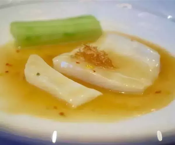 3.将煨山药的糖汁过细罗,注入另一锅中,加入桂花酱,将汁熬浓,浇在山药上即成。