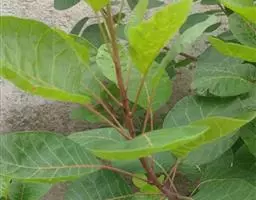 粉背黄栌叶卵圆形,较大,长3.5-10厘米,宽2.5-7.5厘米,无毛,但叶背显著被白粉;叶柄较长,…