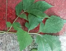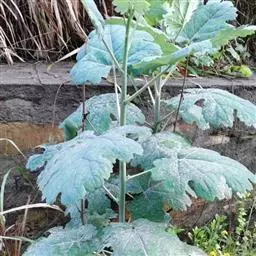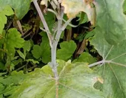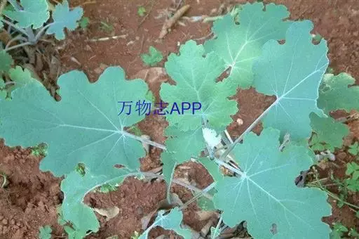 直立草本,基部木质化,具乳黄色浆汁。茎高0.8-1米,通常淡黄绿色,光滑,多白粉,中空,上部多分枝。叶片宽卵形或近圆形,长5-14厘米,宽5-12厘米,先端急尖、钝或圆形,基部心形,通常7或9深裂或浅裂,裂片半圆形、扇形或其他,边缘波状、缺刻状、粗齿或多细齿,表面绿色,无毛,背面多白粉,被绒毛,基出脉通常5,侧脉1对,稀2对,细脉网状;叶柄长4-11厘米,上面平坦,通常不具沟槽。