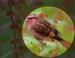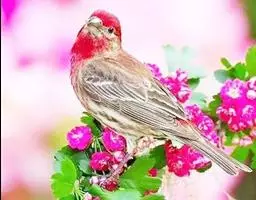 红腰朱雀:体长12-14厘米,小型鸟类。雄鸟前额和眉纹玫瑰粉红色,头顶和一宽的贯眼带深红褐色,背红…