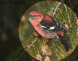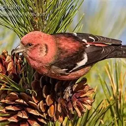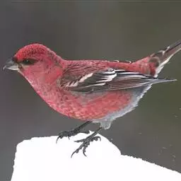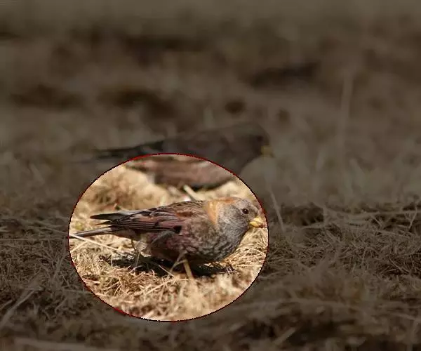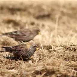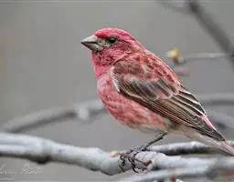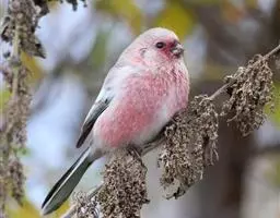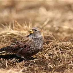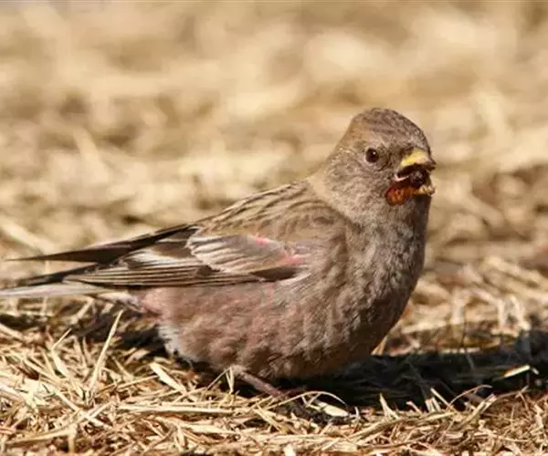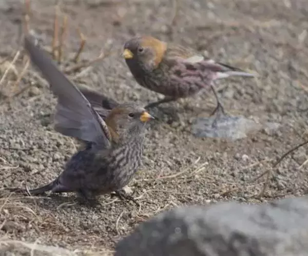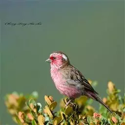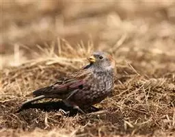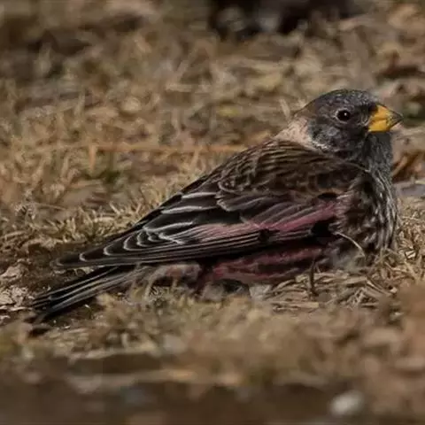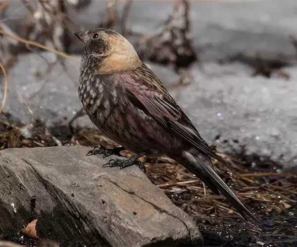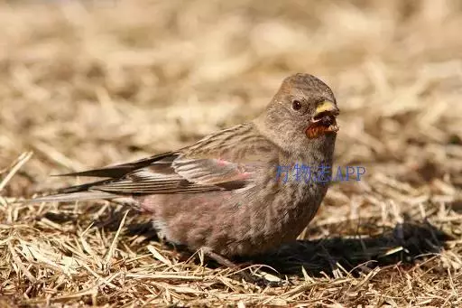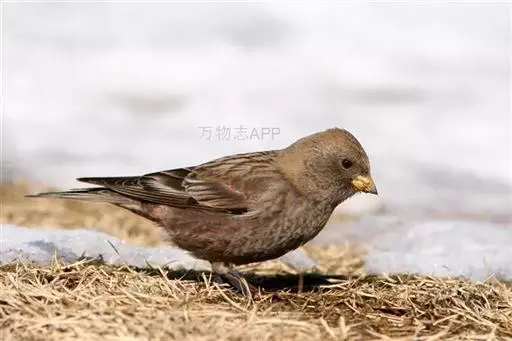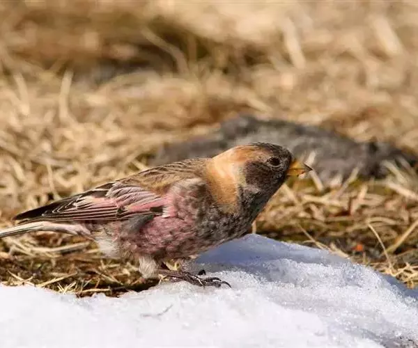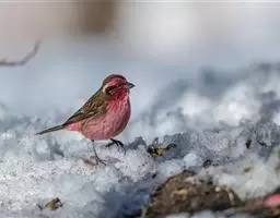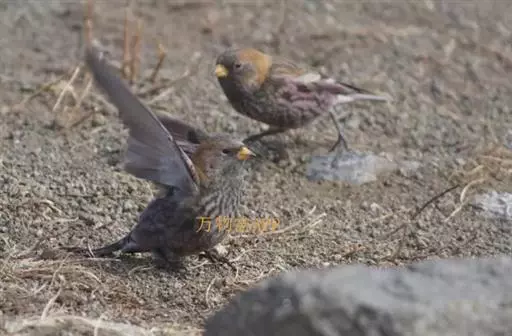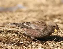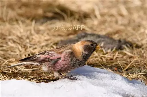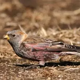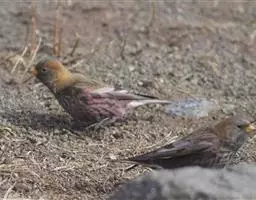 粉红腹岭雀(学名:Leucosticte arctoa):为燕雀科岭雀属的鸟类。体重25-34克,体长150-182毫米。是一种中等体型的深色岭雀。两翼及下体玫红色。东北亚种的雄鸟额、顶冠及脸灰;上背黄褐;上体深褐,沙色的羽缘成鳞状斑;两翼近黑而羽缘粉红;尾近黑而具白色羽缘;下体褐色,羽片中心粉红;冬季鸟的头顶、颈背及颈圈皮黄褐色。雌鸟较雄鸟色暗,两翼的粉红色仅限于覆羽。指名亚种成年雄鸟翼羽具宽阔的羽缘而使合翼时看似白色;体羽无粉红且腰及臀为浅色。与朱雀的区别在黄色的嘴较厚且头无粉红色。虹膜褐色;嘴黄色,嘴端黑色;脚黑色。