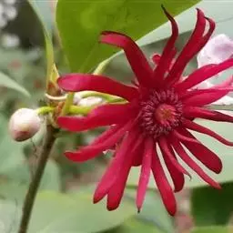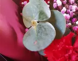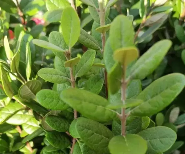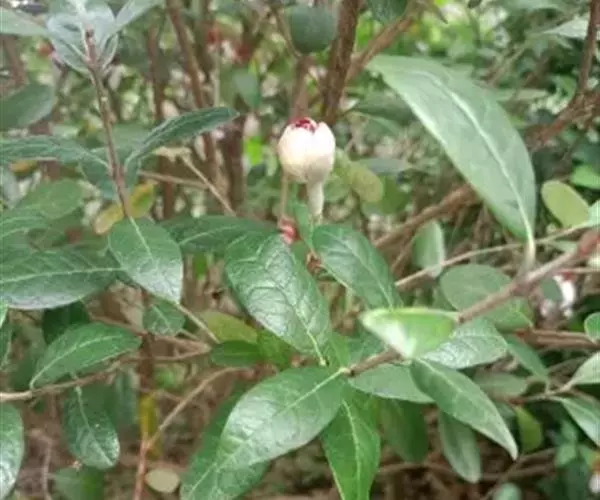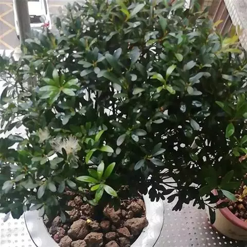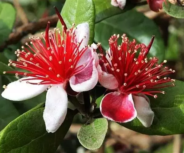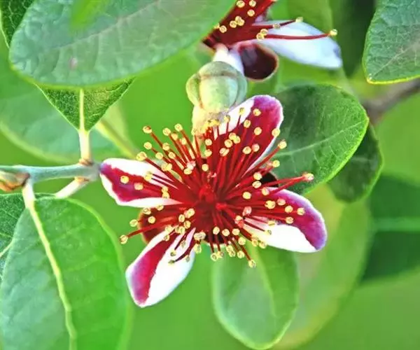 叶厚革质,椭园形对生,长5-7cm,深绿色,具油脂光泽,四季常绿。叶背面有银灰色细绒毛。枝叶修剪时散发出令人愉快的芳香,有益人体健康。花单生,花辨倒卵形,紫红色,外被白色绒毛。花两性,雄蕊和花柱红色,顶端黄色,花色艳丽,且可食用。