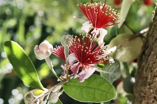 菲油果高可达5~6 m,树皮呈浅灰色,枝节间膨胀,幼时有白毛;枝叶深绿发亮,叶厚革质,对生,椭圆形,长5~7.5 cm,叶背面有银灰色的茸毛;花单生或簇生,花径4 cm,花形奇特,花瓣为倒卵形,花瓣4~6瓣,花瓣背面白色,内带紫色,花两性,自花授粉,花柱和雄蕊红色,顶端黄色;花期为5月下旬至6月上旬 。浆果,长椭圆形至卵形,大小如猕猴桃,长2.5~7 cm,果皮蜡质,光亮,暗绿色,成熟时略微带红色,果期为深秋至初冬,熟时果肉为黄色,半透明状,果汁丰富;种子较小,埋于果肉当中,可食,有香蕉和草莓的香甜味道。