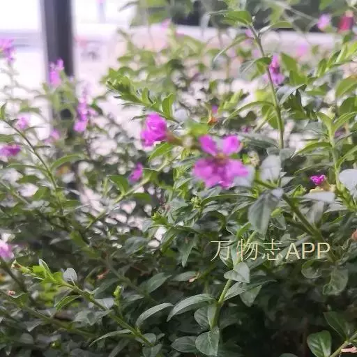 萼距花(Cuphea hookeriana Walp.)千屈菜科、萼距花属灌木或亚灌木状,高30-70厘米,直立,粗糙,被粗毛及短小硬毛,分枝细,密被短柔毛。叶薄革质,披针形或卵状披针形,稀矩圆形,顶部的线状披针形,顶端长渐尖,基部圆形至阔楔形,下延至叶柄,幼时两面被贴伏短粗毛,后渐脱落而粗糙,矩圆形,深紫色,波状,具爪,其余4枚极小,锥形,有时消失;突出萼筒之外,花丝被绒毛;子房矩圆形。