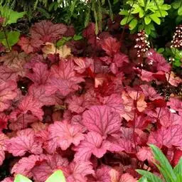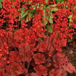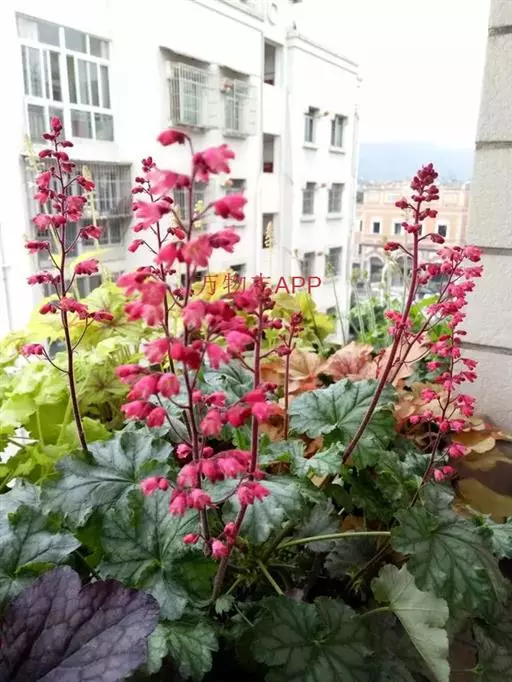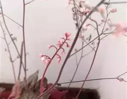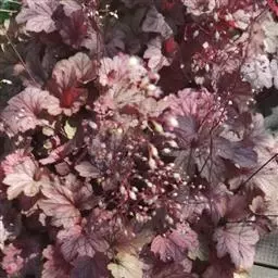 矾根(Heuchera micrantha)又名珊瑚铃,虎耳草科矾根属,多年生耐寒草本花卉,浅根性。叶基生,阔心形,长20-25cm,深紫色,在温暖地区常绿,花小,钟状,花径0.6-1.2cm,红色,两侧对称。