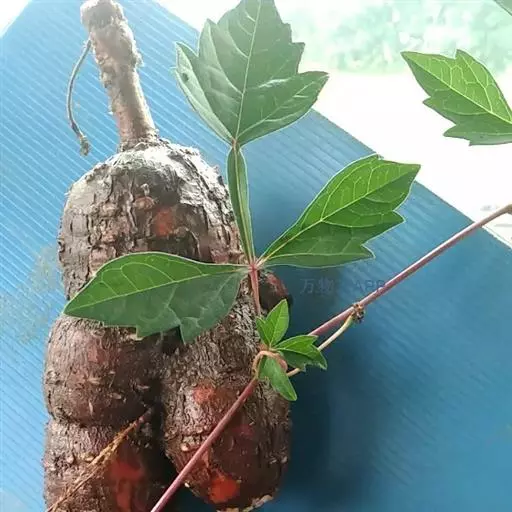 落叶攀援木质藤本,长约1m。块根粗壮,肉质,卵形、长圆形或长纺锤形,深棕褐色,数个相聚。茎多分枝,幼枝带淡紫色,光滑,有细条纹;卷须与叶对生。掌状复叶互生;叶柄长3-5cm,微淡紫色,光滑或略具细毛;叶片长6-10cm,宽7-12cm;小叶3-5,羽状分裂或羽状缺刻,裂片卵形至椭圆状卵形或卵状披针形,先端渐尖,基部楔形,边缘有深锯齿或缺刻,中间裂片最长,两侧的较小,中轴有闲翅,裂片基部有关节,两面无毛。