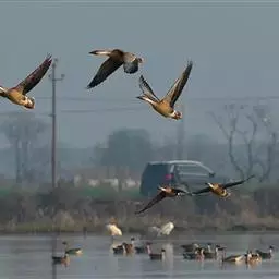 豆雁,雁形目鸭科。成鸟头、颈、背灰褐色,带淡黄色羽缘;尾上覆羽白色,尾羽黑褐色带白端,…