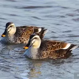 斑嘴鸭:羽褐色,上嘴黑,端有黄斑,翼镜紫蓝。
