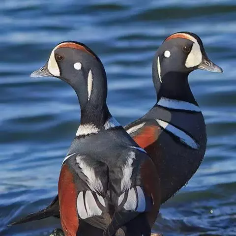 针尾鸭:头深褐色,颈侧与下体连成鲜明白色,翼镜为暗铜绿色,中央尾羽延长。