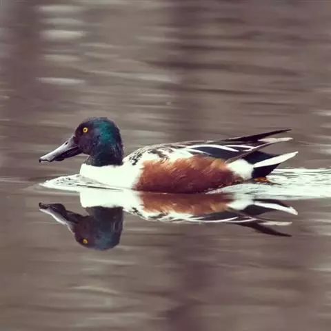 琵嘴鸭:嘴前端扩大成铲状,头颈黑紫色,胸白,翼镜绿,腹红褐。