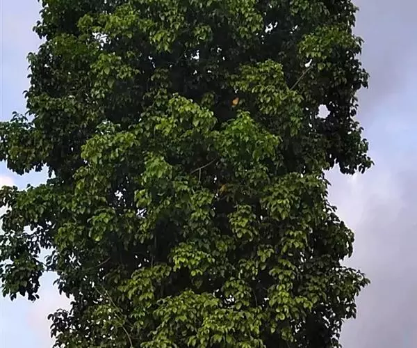 常绿或半常绿大乔木,高达40米,胸径可达2.3米;树干圆满通直,但分枝低,主干较短;树皮灰褐色至棕褐色,厚约1厘米,近平滑,老树皮粗糙,内皮纤维质,稍脆;砍伤树皮后流出汁液红色,干凝后变瘀血状;木材鲜时有酸味,干后无味,表面槽棱突起;小枝无毛。三出复叶,稀5小叶,总叶柄长8-20厘米;小叶片纸质,卵形、椭圆形、倒卵形或椭圆状卵形,长7-15厘米,宽4-8厘米,顶端急尖或短尾状渐尖,基部宽楔形至钝,边缘有浅锯齿,每1厘米长有2-3个,幼时仅叶脉上被疏短柔毛,老渐无毛;顶生小叶柄长2-5厘米,侧生小叶柄长5-20毫米;托叶膜质,披针形,长约8毫米,早落。