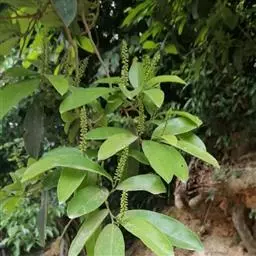 花小,雌雄异株,多朵组成腋生的圆锥花序;雄花序长8-13厘米,被微柔毛至无毛;雌花序长15-27厘米,下垂;雄花:直径达2.5毫米;萼片膜质,半圆形,内面凹成勺状,外面被疏微柔毛;花丝短;退化雌蕊小,盾状,被短柔毛;雌花:萼片长圆状卵形,内面凹成勺状,外面被疏微柔毛,边缘膜质;子房光滑无毛,3-4室,花柱3-4,线形,顶端不分裂。果实浆果状,圆球形或近圆球形,直径6-13毫米,淡褐色;种子长圆形,长约5毫米。花期4-5月,果期8-10月。