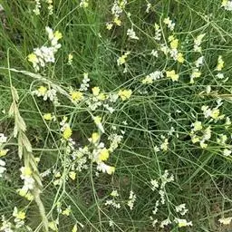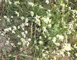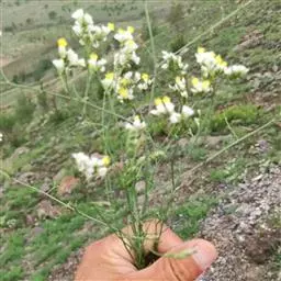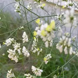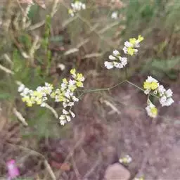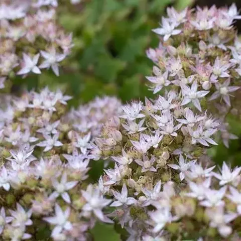 水晶草花细小纤弱,花朵约3毫米大,有5个花瓣,花开呈五角形。花蕊黄色,花瓣薄如纱,晶莹透亮,似水晶一般,闻起来略有清香。她先开黄花,后渐渐变白,一般7-9朵花簇生在一起。花期在5-7月,花开时候,黄白相间,尤其在微风下,有如繁星闪动,挂满天边,如果远眺一瞥,又仿佛朵朵云霞一片。水晶草生命力极强,易自播繁殖。