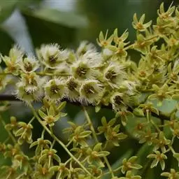 总状花序生于枝顶叶腋内,长4-7厘米,有花5-14朵,花序轴被褐色柔毛;花柄长8-10毫米,,花长1.5厘米,直径1-2厘米;花芽披针形,长1.2厘米;萼片6片,狭窄披针形,长1.4厘米,宽1.5-2毫米,外面被褐色柔毛;花瓣倒披针形,长1.3厘米,内外两面被银灰色长毛,先端7-8裂,裂片长3-4毫米;雄蕊45-50枚,长1厘米,花丝长2毫米,花药长4毫米,顶端有长达3-4毫米的芒刺;花盘5裂,不明显分开,有浅裂;子房被毛,3室,花柱长9毫米,有毛。核果椭圆形,长3-3.5厘米,有褐色茸毛。花期8-9月,果实在冬季成熟。