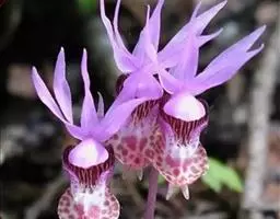 花瓣中部以下白色,上部洋红色,卵形,长2毫米,宽1.2毫米,先端钝;唇瓣3裂,分前后两部分;后部为侧裂片,直立,较大,半圆形,长2毫米,宽2毫米,与中裂片连接处具1个近球形的胼胝体;前部为中裂片,厚肉质,翘起,长约2毫米,上面中央隆起呈圆锥形,基部具可动的关节;距囊状,长约3毫米,基部上方弯曲,末端指向前;蕊柱黄色,粗短,长约1毫米;蕊喙很小,尖齿状,长约0.4毫米;药帽黄色,前端伸长并且翘起,先端近截形带3个尖齿;粘盘柄扁平,着生于粘盘中部,长约1毫米,宽0.3毫米;粘盘鳞片状,长2毫米,宽0.5毫米,两端锐尖。
