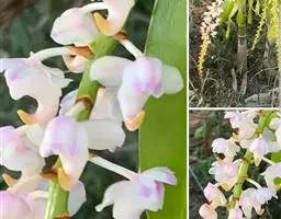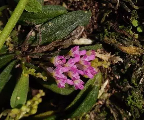 圆叶匙唇兰(学名:Schoenorchis tixieri (Guillaum.) Seidenf.):植株矮小,高1-3厘米。茎很短,不明显,密被覆瓦状叶鞘所包。叶质地厚,表面黑绿色,具皱纹,扁平,长圆形或椭圆形。总状花序从叶腋中发出,约等长于叶,下垂,密集许多小花;花序轴肉质,具肋棱;花稍肉质,不甚伸展,萼片洋红色;花瓣中部以下白色,上部洋红色,卵形,长2毫米,宽1.2毫米,先端钝;唇瓣3裂。