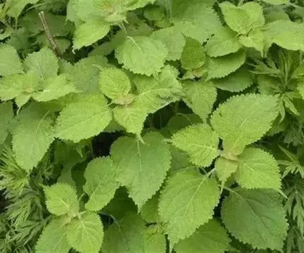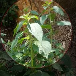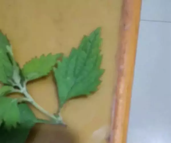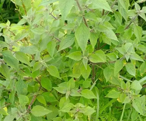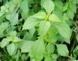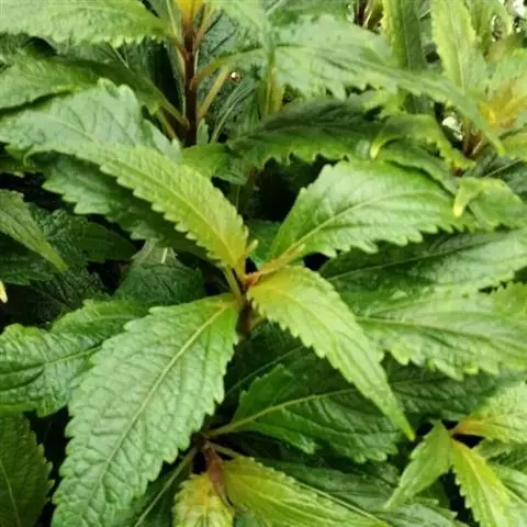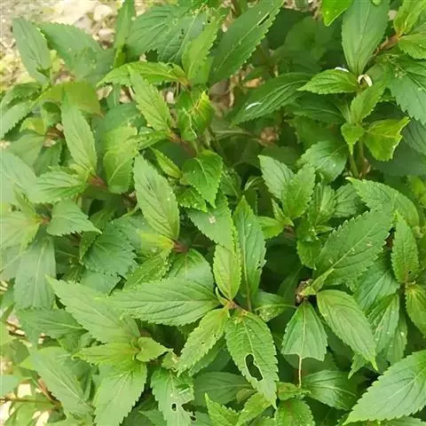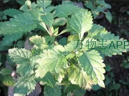 茎叶对生,卵圆形或菱状卵圆形,长2-6厘米,宽1.3-3厘米,先端锐尖或渐尖,后一情况顶端一齿较长,基部宽楔形,骤然渐狭下延成假翅,边缘具粗圆齿状锯齿,齿尖具胼胝体,膜质至坚纸质,上面榄绿色,疏被小疏柔毛及腺点,有时近无毛,下面淡绿色,密被灰白色短绒毛至近无毛,侧脉3-4对,两面十分明显,脉纹常带紫红色;叶柄连具翅假柄在内长1-3.5厘米,向茎、枝顶部渐变短。