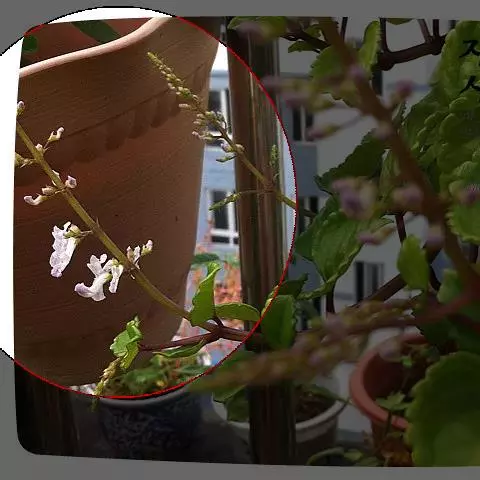聚伞花序3-5花,最下部者有时多至7花,具长2-5毫米的总梗,在茎及分枝顶上排列成长6-15厘米狭圆锥花序,总梗与长2-5毫米的花梗及序轴密被微柔毛,但常带紫红色;苞叶菱形或菱状卵圆形至披针形,向上渐变小,在圆锥花序下部者十分超出于聚伞花序,在上部者则往往短于聚伞花序很多,先端急尖,基部宽楔形,边缘具疏齿至近全缘,具短柄至近无柄,小苞片钻状线形或线形,长达1.5毫米,被微柔毛。花萼钟形,长2.5-3毫米,外密被灰色微柔毛及腺点,明显带紫红色,内面无毛,10脉,萼齿5,微呈3/2式二唇形,齿均卵圆状三角形,近钝尖,约占花萼长之半,上唇3齿,中齿略小,下唇2齿稍大而平伸,果时花萼增大,管状钟形,略弯曲,长4-5毫米,脉纹明显。花冠长约7毫米,有时达12毫米,但也有雄蕊退化的花冠变小,长仅5毫米,外疏被微柔毛及腺点,内面无毛,冠筒长3.5-5毫米,基部上方浅囊状突起,至喉部直径2-2.5毫米,冠檐二唇形,上唇长2.5-4毫米,外反,先端具4圆齿,下唇宽卵圆形,长3.5-7毫米,内凹。雄蕊4,略伸出,或有时雄蕊退化而内藏,花丝扁平,中部以下具髯毛。花柱丝状,伸出,先端相等2浅裂。花盘环状。
