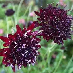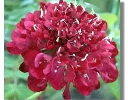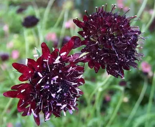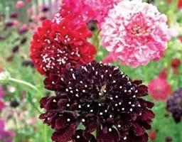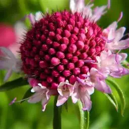紫盆花(学名:Scabiosa atropurpurea Linn.)是川续断科蓝盆花属植物。一年生草本,高30-70厘米,茎多分枝,微具棱,棱上疏生白色卷伏毛。基生叶长圆状匙形;茎生叶对生,基部相连;叶片轮廓长圆形,长5-12厘米,宽3-7厘米。头状花序单生分枝顶端,圆头状,径4-5厘米。果序长卵形或长圆形,长4.5厘米,宽3.5厘米(连萼刺)。花期6-7月。