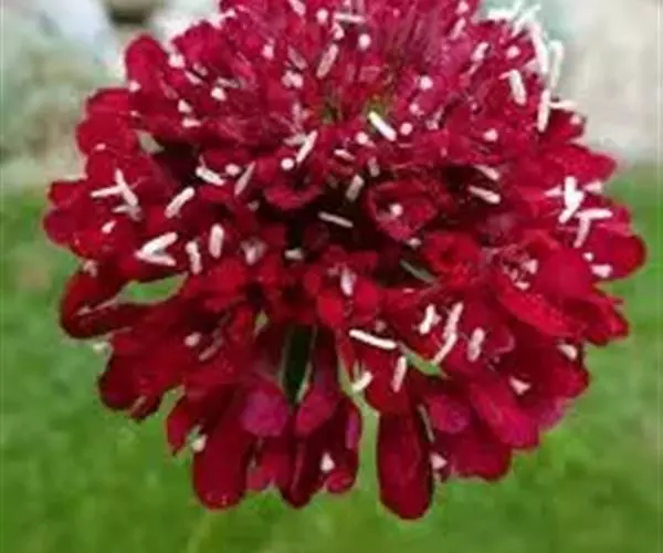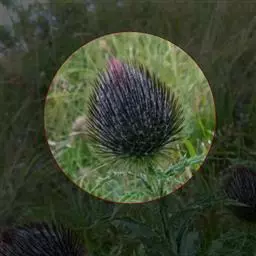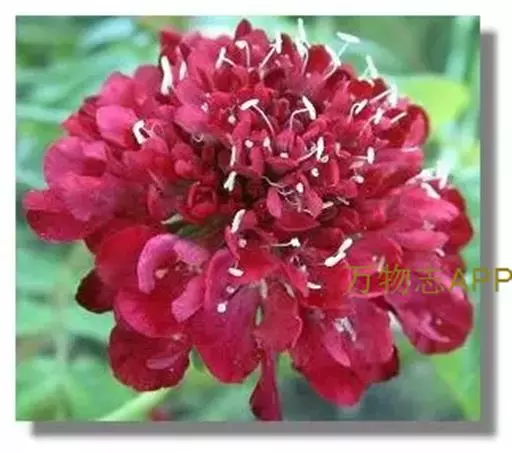 头状花序单生分枝顶端,圆头状,径4-5厘米;总苞苞片2层,12-14片,内层较短,长8-12毫米,披针形,先端渐尖,密生白色短柔毛;小总苞筒状,长约6毫米,基部钝圆,疏生长硬毛,上部扩大成花篮状,全长具8条纵肋,肋弯拱,上部肋间显膜质,顶端分为8个圆裂片,裂片边缘棱状,冠部小,反卷;萼刺刚毛5条,棕黄色,长约8毫米,上面具短毛;花冠紫黑色、淡红色至白色,边花大,筒部漏斗形,长约10毫米,外面密生白色柔毛,裂片5,长圆形,不等大,长7-8毫米;雄蕊4,与花冠近等长;子房包于小总苞内,花柱伸出花冠筒外,柱头头状。果序长卵形或长圆形,长4.5厘米,宽3.5厘米(连萼刺)。花期6-7月。