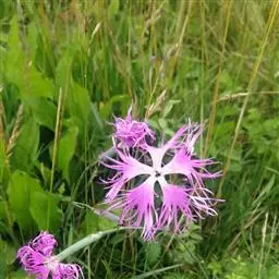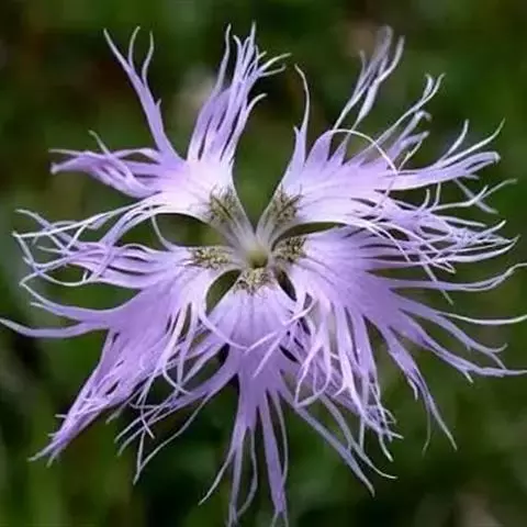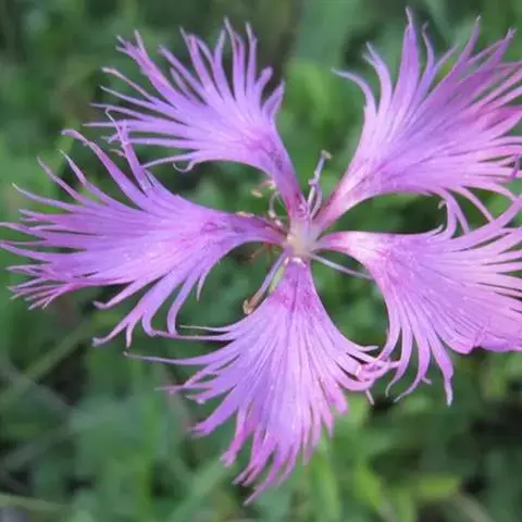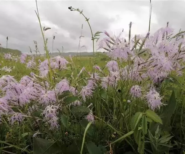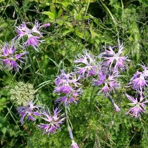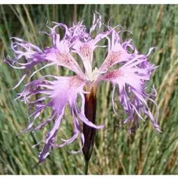 瞿麦,别名:高山瞿麦,拉丁文名:Dianthus superbus L. 石竹科、石竹属多年生草本,高50-60厘米,有时更高。茎丛生,直立,绿色,无毛,上部分枝。叶片线状披针形,顶端锐尖,中脉特显,基部合生成鞘状,绿色,有时带粉绿色。包于萼筒内,瓣片宽倒卵形,边缘繸裂至中部或中部以上,通常淡红色或带紫色,稀白色,喉部具丝毛状鳞片;雄蕊和花柱微外露。蒴果圆筒形,与宿存萼等长或微长,顶端4裂;种子扁卵圆形,长约2毫米,黑色,有光泽。花期6-9月,果期8-10月。