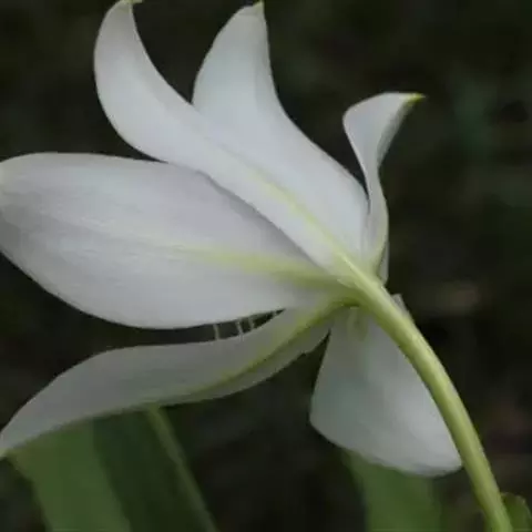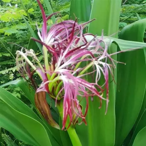 多年生粗壮草本。叶带形,长70厘米或更长,宽3.5-6厘米或更宽。伞形花序有花数朵至10余朵,下有佛焰苞状总苞片2枚,披针形,长约9厘米,小苞片多数,线形;花梗很短;花被近漏斗状的高脚碟状;花被管长约9厘米,常稍弯曲;花被裂片披针形或长圆状披针形,长约7.5厘米,宽约1.5厘米,顶端短渐尖,白色,有红晕;雄蕊6,花丝短于花被,花药线形,长1.2-1.8厘米。花期6-8月。