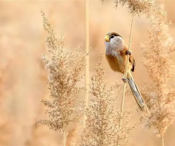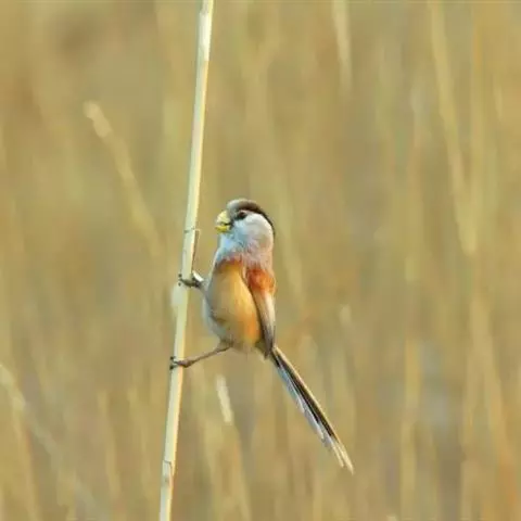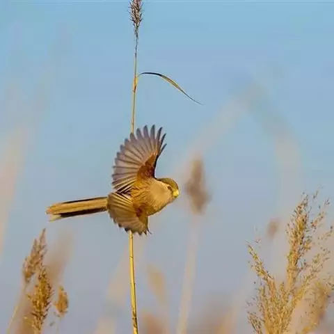 震旦鸦雀也是快乐的小精灵,结小群栖于芦苇地,它们的叫声急促而连贯,非常好听,唱得高兴的时候,它们还会展翅欢唱,可是力度并不大,但扇翅膀的频率比较高,一边振翅,一边低唱。