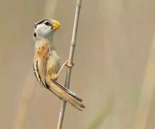 白眶鸦雀是莺科、鸦雀属小型鸟类,体长12-14厘米。嘴黄色、短而粗厚,头顶至后颈褐色沾棕具白色眼圈,…