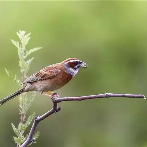 栗斑腹鹀:属小型鸣禽。体重19-25克,体长145-167毫米。头顶至背栗红色,眼先和颧纹黑褐色,…