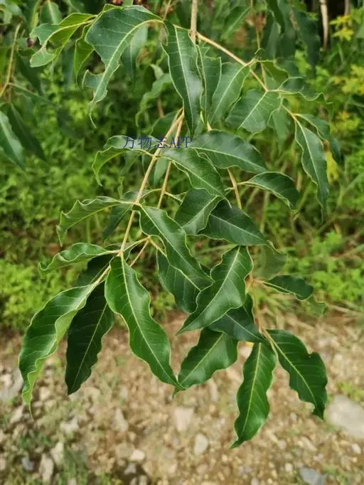 树高达20米,胸径80厘米。树皮灰白色,不开裂,密生圆或扁圆形、略凸起的皮孔。叶有小叶7-11片,很少5片或更多,小叶斜卵状披针形,通常长6-10厘米,宽2.5-4厘米,少有更大的,两则明显不对称,油点不显或甚稀少且细小,在放大镜下隐约可见,叶背灰绿色,干后略呈苍灰色,叶缘有细钝齿或全缘,无毛;小叶柄长1-1.5厘米,很少短至6毫米或长达2厘米。