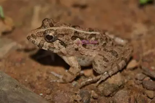 外形似虎纹蛙而体形小,体长50~55毫米。趾间半蹼。吻部较尖,上下唇有6~8条黑纵纹;两眼间有“V”字形斑,肩部一般有“W”字形斑,有的还有宽窄不一的青绿色或浅黄色脊线纹。背面灰橄榄色、深灰色或棕褐色,有的杂以赭红、深绿色斑;无背侧褶,有许多分散排列、长短不一的纵肤棱。雄蛙有灰黑色单咽下外声囊,鸣声响亮,生活在稻田、沼泽、菜园附近。体长40~55毫米左右,雄蛙略小;头长宽相等;吻端尖圆,吻棱圆;鼻孔距吻较距眼略近,眼间距窄,为上眼脸宽1/2;鼓膜为眼径的2/3;犁骨齿两团,向后集中而不相遇。指趾端钝尖;第一指发达,指长顺序3、1、4、2;关节下瘤及掌突发达。后肢较短,胫跗关节前达眼部附近,左右跟部稍重叠;趾间的蹼约达2/3;关节下瘤小而明显;内蹠突窄长,有时与跗褶相连,外蹠突小,有时与第五趾之蹠褶相连。背面的皮肤有许多不规则、分散排列之长短纵肤褶,而无背侧褶;体侧多为圆形疣,后肢背面也有小疣;头部两上眼睑后方有一窄的横肤沟;颞褶明显;腹面皮肤光滑。生活时颜色变异颇大,背面为棕灰色或灰棕橄榄绿色,有时杂以赫红色,深棕色斑纹颇显菩;上下唇缘有六至八条明显的纵纹;两眼之间有横斑,背面在前肢肩部多少成∨∨形斑,断续情况不一;两侧斑纹的凹入部分适与肩部浅色点相对;背后端有∨字形纹或短横纹;少数标本背部正中有浅色宽窄不一的脊线;四肢有横纹;雄性咽部黑色,其余为白色。雄性体略小,第一指上浅色婚垫发达;有单咽下外声囊,咽部黑色。蝌蚪体肥,后肢5毫米时,全长34毫米,尾长为体长的两倍;尾较细弱,尾端尖圆;蝌蚪橄榄绿色上有棕赫麻点,沿着尾鳍的上缘有若干显著的短黑楼斑,腹面无斑纹;口小、唇齿式1:1~1/Ⅲ;角质颌不强,唇乳突在口角两侧延至下唇两侧,而下唇中部乳突则缺如。