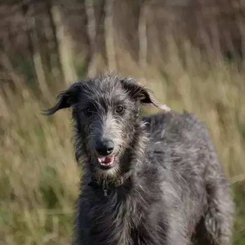 颅骨扁平,中等程度狭窄,自头顶向双眼逐渐变窄,头部没有过多的棱角,但从侧面看自额头到上颔部分较灰猎犬有更多的凹陷。可以看到虽然正前面部从眼到嘴逐渐变窄,下颔两侧稍向内倾斜,但其不会在眼下部分产生突然的变化,这些部位都相当丰满,像经过精雕细琢后呈现的“楔形”。比例适当的头部,其颅骨的长度和前脸的长度稍有不同,颊部扁平。