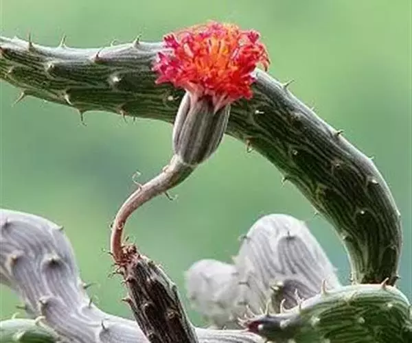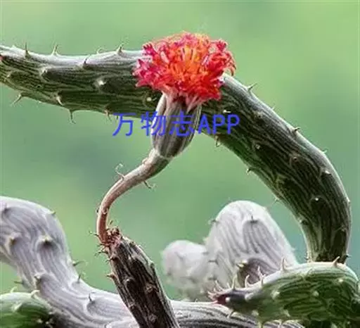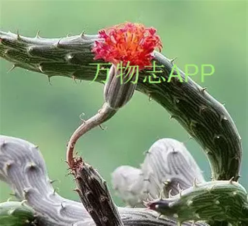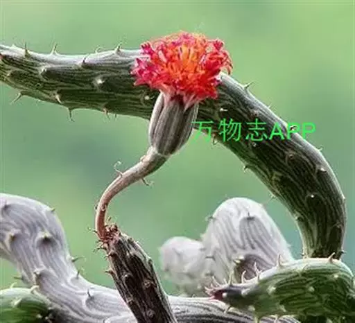 泥鳅掌 植株呈矮小的肉质灌木状,茎圆筒形,两头略尖,匍匐性,接触土壤即生根。平卧于地上,具节,每节长10~30厘米,直径1.5~2厘米,表皮灰绿或褐色,有深绿色线状纵条纹。叶线形,0.2厘米长,早干枯,但干枯后并不脱落,而是宿存在变态茎上,如同小刺。总花梗上有头状花序1~2朵,直径3厘米,花橙红或血红色。