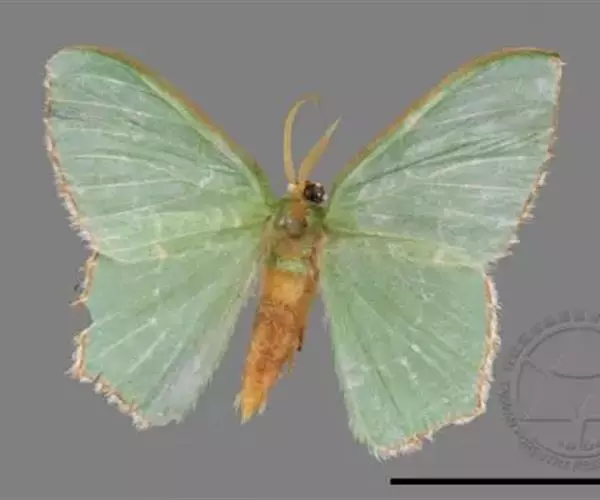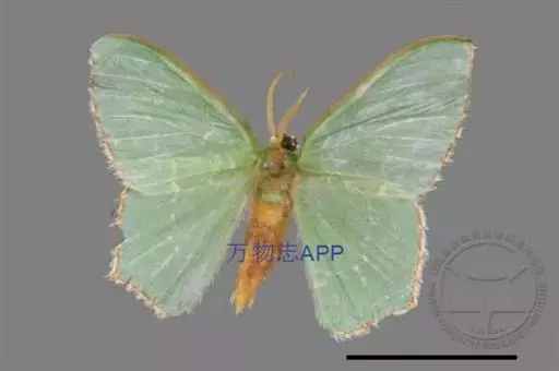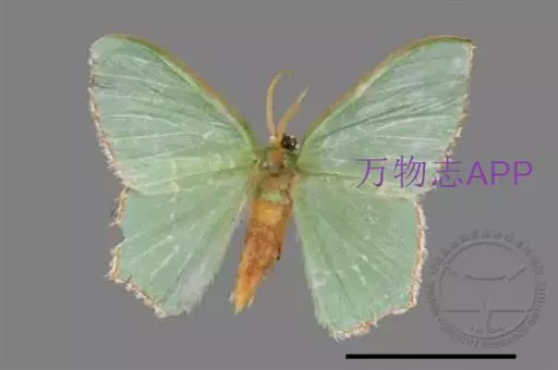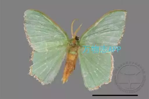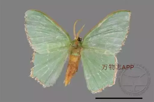 前翅长9mm。雄触角双栉形,雌锯齿形。下唇须短小细弱,红褐色。额红褐色。头顶和胸腹部背面黄白色。雄后足胫节具毛束,仅1对端距。翅黄绿色,隐见白色外线,波状;后翅外线中部外凸;前翅内线极弱或消失,有时可见极弱暗色中点;缘线鲜红褐色,在翅脉端间断;缘毛黄白色,在翅脉端红褐色,但在前翅顶角至 M2脉和后翅M2各脉端红褐色大部或全部消失。翅反面色较浅,缘线同正面。后翅外缘在M3处形成凸角,在M1处形成较小凸齿,2齿间凹。