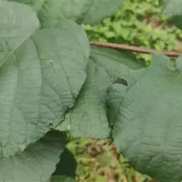 叶膜质或纸质,卵形、长圆形、阔卵形至近圆形,长6-12厘米,宽5-10厘米,顶端急短尖,基部圆形至浅心形,等侧或稍不等侧,边缘具繁密的锐锯齿,腹面深绿色,无毛,背面绿色,侧脉腋上有髯毛或连中脉和侧脉下段的两侧沿生少量卷曲柔毛,个别较普遍地被卷曲柔毛,横脉和网状小脉细,不发达,可见或不可见,侧脉稀疏,6-7对,分叉或不分叉;叶柄长3-6(-10)厘米,无毛或略被微弱的卷曲柔毛。