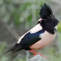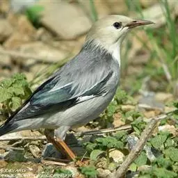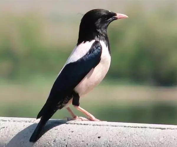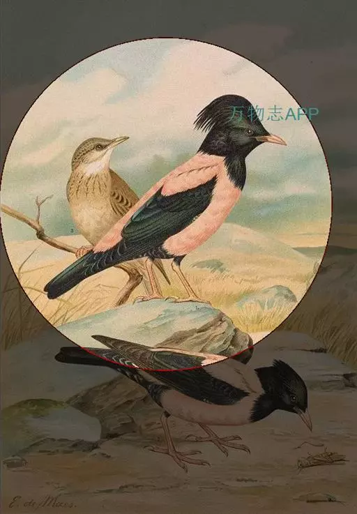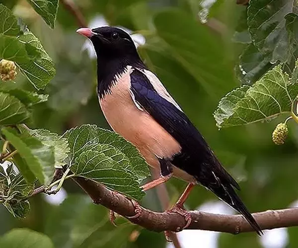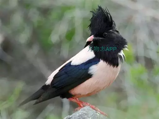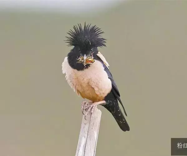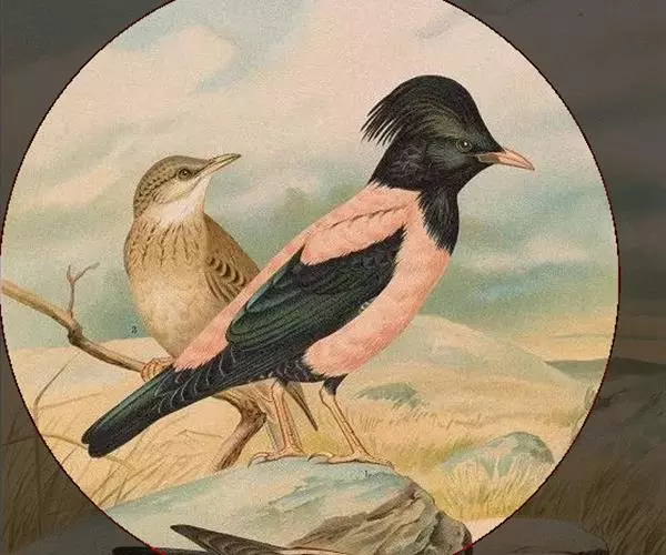 粉红椋鸟(学名:Sturnus roseus):中等体型,成鸟体长19-22厘米,体重60-73克,飞羽、尾羽为亮黑色,雌鸟与雄鸟毛色相似,但较黯淡。形似八哥,但背部及腹部粉红色,故称粉红椋鸟。余羽棕黑,十分可爱。雌鸟图纹相似但较黯淡。虹膜黑色;嘴粉褐色;脚粉褐色。飞行时发Ki-ki-ki的叫声,也有平淡的shrr声。群鸟进食时发出卷舌音chik-ik-ik-ik的叫声。