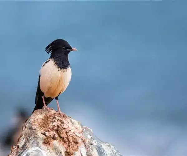 每年5-7月份,粉红椋鸟就会成群结队地迁飞至繁殖地,先在食物丰富的低山地带落脚,然后集群占据石头堆、崖壁缝隙等处选择巢址。为了争夺有利地势,雄鸟之间经常发生激战。雄鸟头顶上部羽毛蓬展,用以恐吓其他雄鸟并吸引雌鸟。通过数日的选配,最终组建成“一夫一妻制”的家庭,开始共同筑巢,准备繁育后代。