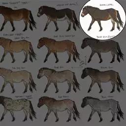 普氏野马:体长约210厘米,肩高约110厘米,尾长90厘米,体重350千克。头部长大,颈粗,耳比驴…