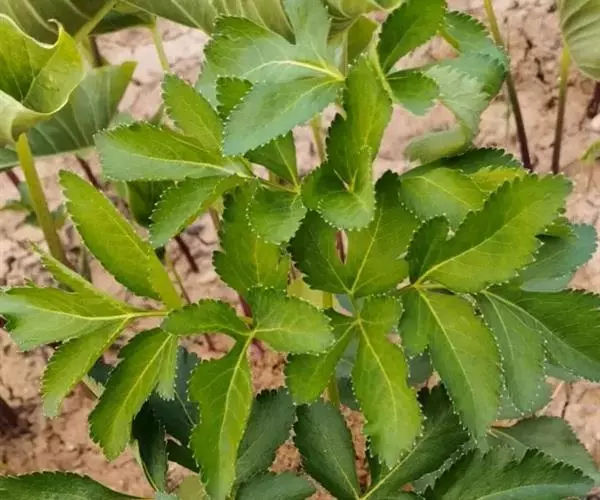 基生叶一回羽状分裂,有长柄,叶柄下部有管状抱茎边缘膜质的叶鞘;茎上部叶二至三回羽状分裂,叶片轮廓为卵形至三角形,长15-30厘米,宽10-25厘米,叶柄长至15厘米,下部为囊状膨大的膜质叶鞘,无毛或稀有毛,常带紫色;末回裂片长圆形,卵形或线状披针形,多无柄,长2.5-7厘米,宽1-2.5厘米,急尖,边缘有不规则的白色软骨质粗锯齿,具短尖头,基部两侧常不等大,沿叶轴下延成翅状;花序下方的叶简化成无叶的、显著膨大的囊状叶鞘,外面无毛。