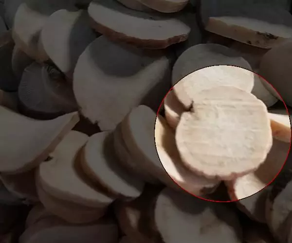 无论晒干或烘干,干燥过程均要连续进行,中间不可中断,否则尽管最后完全干燥,但其根心部会变黑而质量下降。每3-4kg鲜根可加工出lkg干药材。