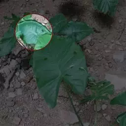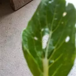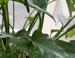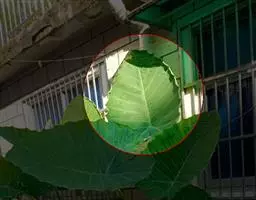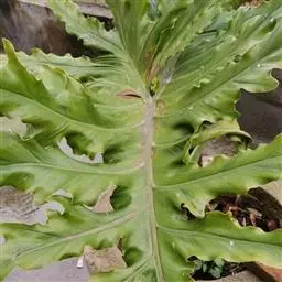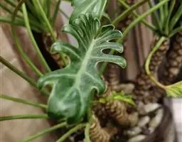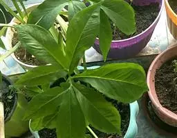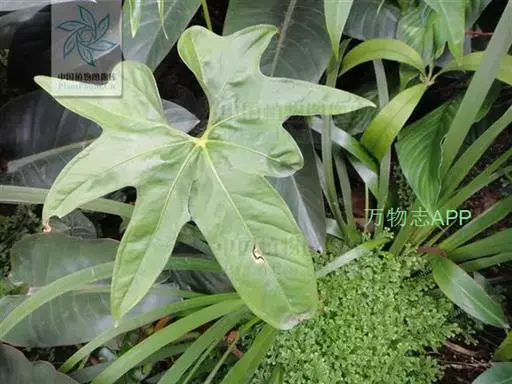 叶片轮廓圆形,直径40-50厘米,亮绿色,具光泽,7-13深裂,裂片披针形或线状披针形,渐尖,最外侧的镰状,各裂片基部联合1/5-1/4,中肋在背面隆起,侧脉纤细,斜伸,集合脉与边缘稍远离。花序柄长40-60厘米。