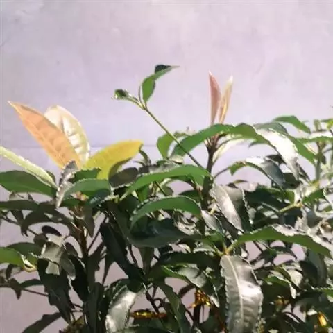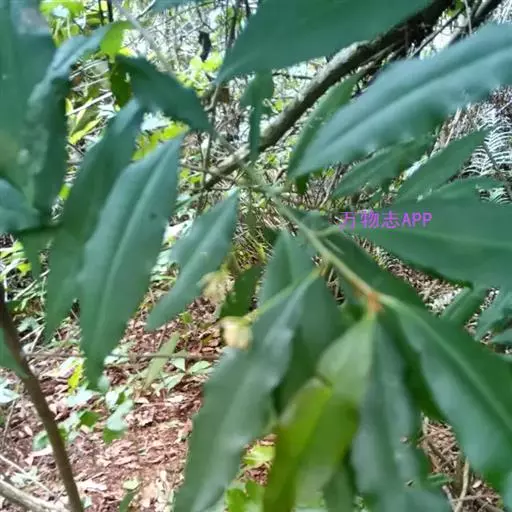 灌木或灌木状小乔木,高约2米,可达6米以上;小枝细,无毛,有纵纹,嫩时被锈色鳞片。叶片坚纸质,长圆状披针形、椭圆状披针形至倒披针形,顶端渐尖,基部楔形,长8-16厘米,宽2-4厘米,全缘,两面无毛,背面多少被鳞片,中脉明显,侧脉极多,不明显,连成近边缘的边缘脉,无腺点;叶柄长5-10毫米,幼时被鳞片。