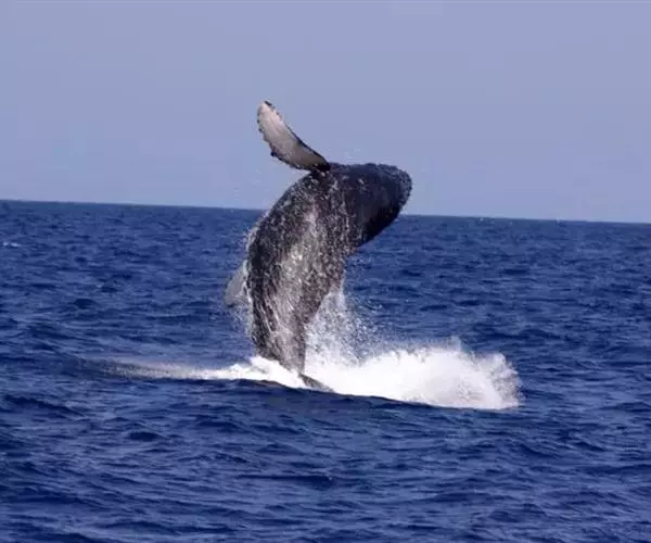 一般鲸类在潜水之前是不会升起尾巴的,但蓝鲸在潜水之前总是将尾巴露出水面,有时竟高高地跃出水面,然后迅速潜入30-40米的水中去寻觅食物。平时它也喜欢用尾鳍打水,这是一种有着多种用途和多种目的的消遣,可能是在做游戏,也可能是为了引起同伴的注意,或许是为了摆脱皮肤上的寄生虫的骚扰。