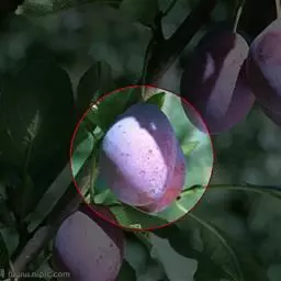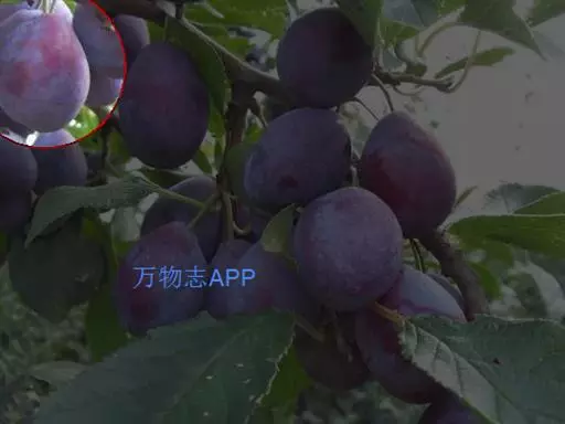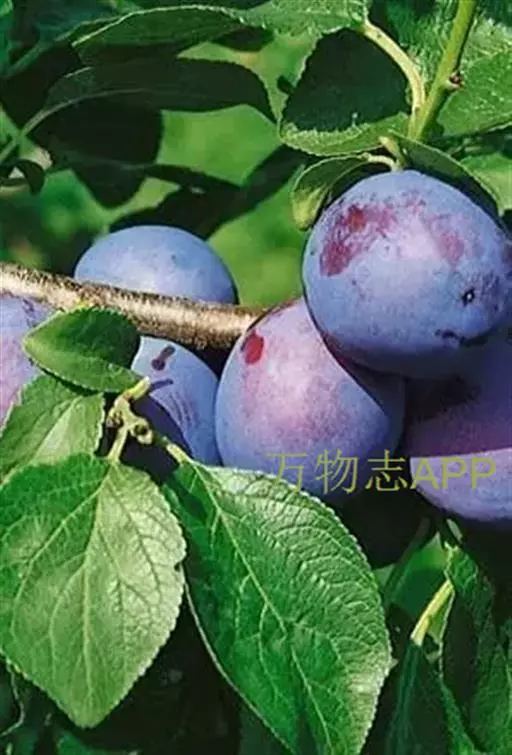 核果通常卵球形到长圆形,稀近球形,直径1~2.5cm,通常有明显侧沟,红色、紫色、绿色、黄色、常被蓝色果粉,果肉离核或粘核;核广椭圆形,顶端有尖头,表面平滑,起伏不平或稍有蜂窝状隆起;果梗长约1.2cm,无毛。花期5月,果期9月。2n=48。