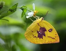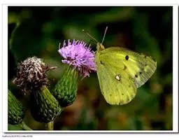 纹黄蝶,翅面黄色,缘毛桃红色;前翅外缘宽的黑边中有几个黄色斑,中室端部有一个黑斑;后翅外缘的黑色斑…