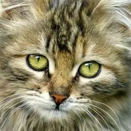 头部:缅因猫头大而圆,颧骨高,鼻梁长,稍凹陷,口呈方形、紧凑眼睛大, 缅因猫 椭圆形,眼色有绿色、金黄色、紫铜色等耳大基宽尖细,两耳间距宽,耳内有密生的长饰毛,并与体毛相衬。