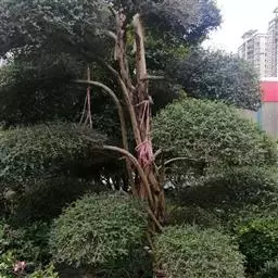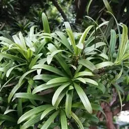 竹柏 竹柏深受庭园、住宅小区及街道绿化人员的选择,一般偏好用大苗移栽。株距以4米、6米为宜,也可根据实际需要确定。挖穴规格视苗木粗细而定,以0.5-0.8米见方,深0.4-0.6米为宜。移植前,应在穴底部施足基肥(也可在种植成活后追肥)。竹柏大苗起苗必须带土团,土团大小依苗木而定,一般胸径3-5厘米带土团直径为15-30厘米。起苗时,先挖去土团周围土壤,用草绳将土球上部缚牢并扎紧,以防土团松散。然后将底部土挖去,切断主根,轻抬至地面,再用草绳将整个土团缚好、扎牢。栽植前应合理修剪枝叶,以防水分蒸发造成干枯。苗木放人栽植穴后,应将草绳四周剪断,以利填土时紧密结合,并使草绳易腐烂,栽好时苗根际表土应高于地面5-10厘米,并浇透水一次,视移栽季节考虑蔽荫情况,成活率一般可达95%以上。