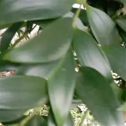 竹柏 叶对生,革质,长卵形、卵状披针形或披针状椭圆形,有多数并列的细脉,无中脉,长3.5-9厘米,宽1.5-2.5厘米,上面深绿色,有光泽,下面浅绿色,上部渐窄,基部楔形或宽楔形,向下窄成柄状。